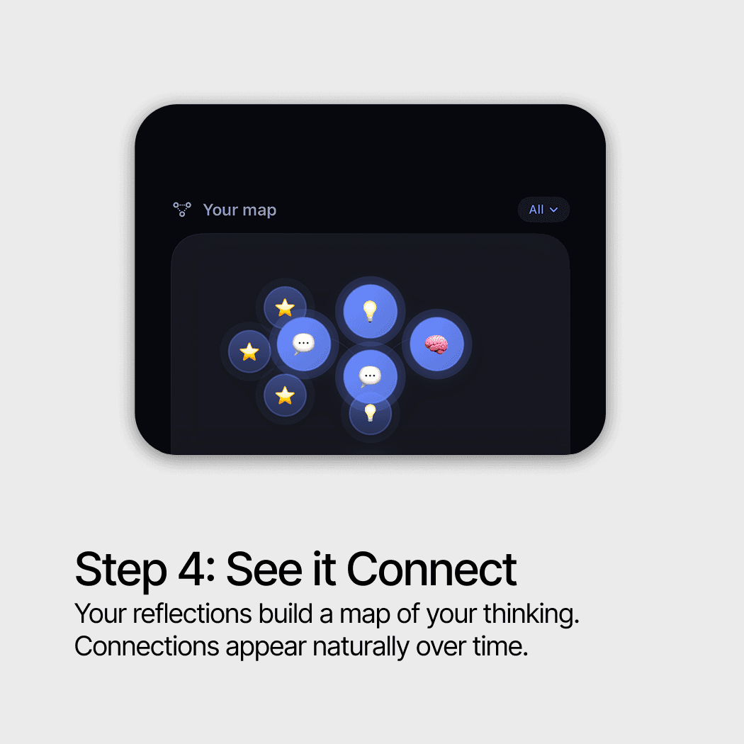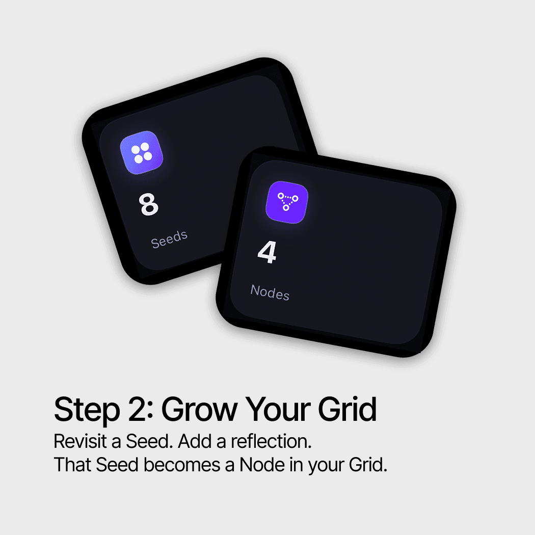 Capture something that stood out as a Seed. Add a quick reflection about why it mattered. When you revisit it later, that Seed grows into a Node in your Grid. Over time, your ideas form a visual network of connections.
