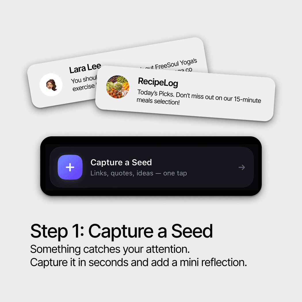 A Seed is a small moment of curiosity. It could be: • a thought you had • a quote you read • a screenshot • a question you want to explore You save it with a short reflection about why it stood out.